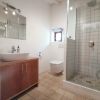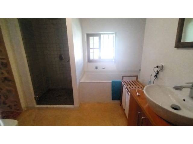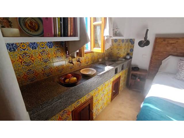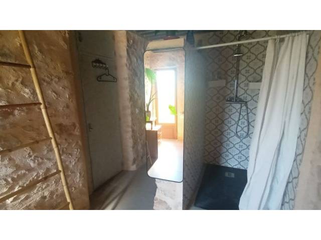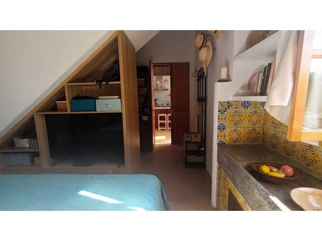 Darüber liegt eine kleine Galerie, welches als Schlafstätte dienen kann. Das grosszügige und helle Bad verfügt über eine Dusche. Es gibt 1 x AC / heiss –kalt, schöne Natursteinmauern und ein Küchenfenster mit Kippfenstersystem und braune Bodenfliesen.