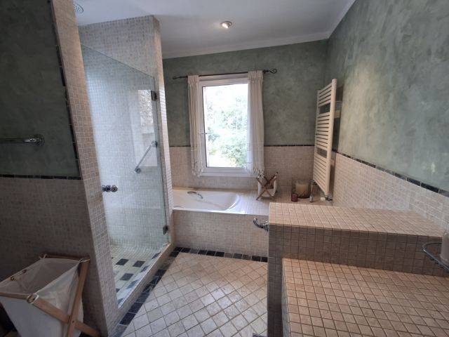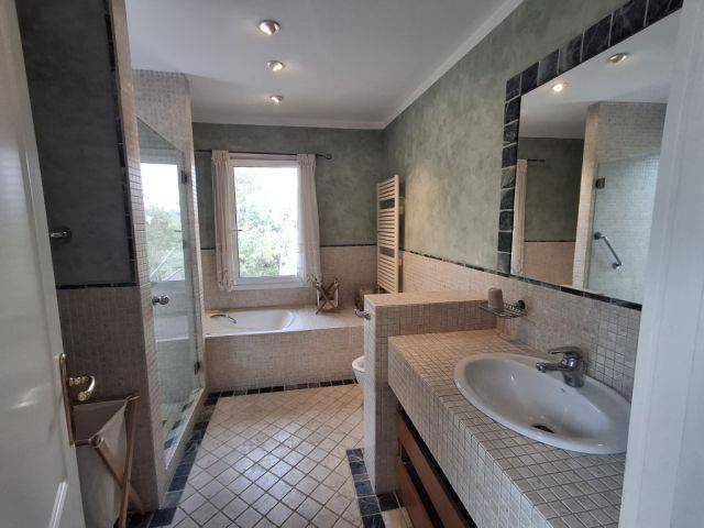 1 Etage verfügt über ca. 160 m2 Wfl. mit einem grossem und hellen Wohnzimmer mit geschlossenem Kamin und Balkon + Terrassenzugang. Einige Stufen höher liegen die 3 Schlafzimmern mit Einbauschränken und 2 Badezimmer ( eines ensuite mit Dusche und Badewanne und eines mit Dusche und Jaccuzi ).