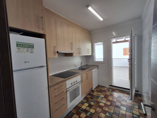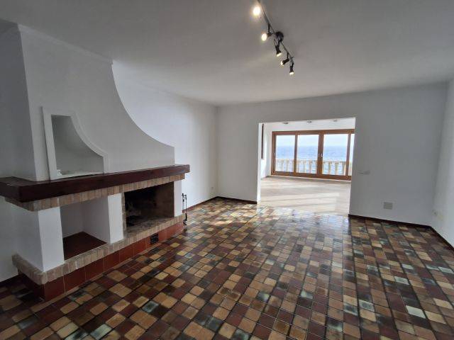 Wir haben einen Eingang mit einem Flur zum Wohn,--Esszimmer mit geschlossenem Kamin und großen Fenstern mit Panoramablick auf das Meer und einem schönen Rundbogen, braune Einbauküche mit Cerankochfelder, Backofen, Kühlschrank und Geschirrspüler mit Zugang zur Terrasse.