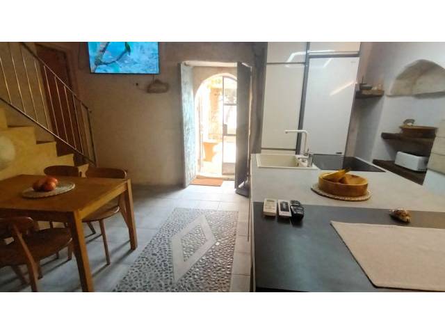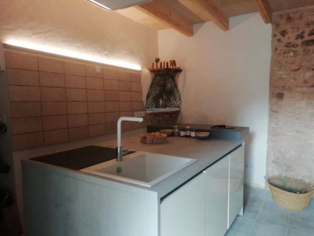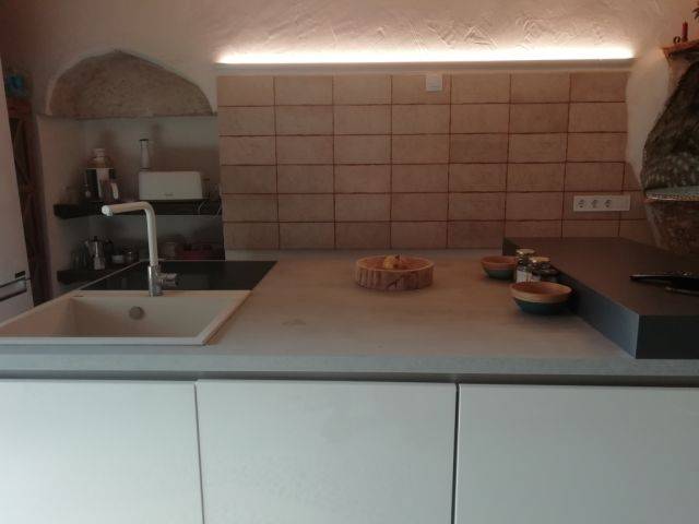 Räumlichkeiten: Das Nebenhaus ( ohne Verbindung zum Haupthaus ) ist ein grosser Raum von ca. 40 m2 und ist sehr hell und zum Süden ausgerichtet. Es hat viele Fenster, genügend Steckdosen und ist mit Natursteinmauern verkleidet. 2 kleine SZ in oberer Etage ( halb offen zur Parterre) und 1 SZ in Parterre. 1 Badezimmer mit Dusche. Eingangsbereich ist die moderne Einbauküche mit Kochinsel und Essbereich mit geschlossenem Kamin.