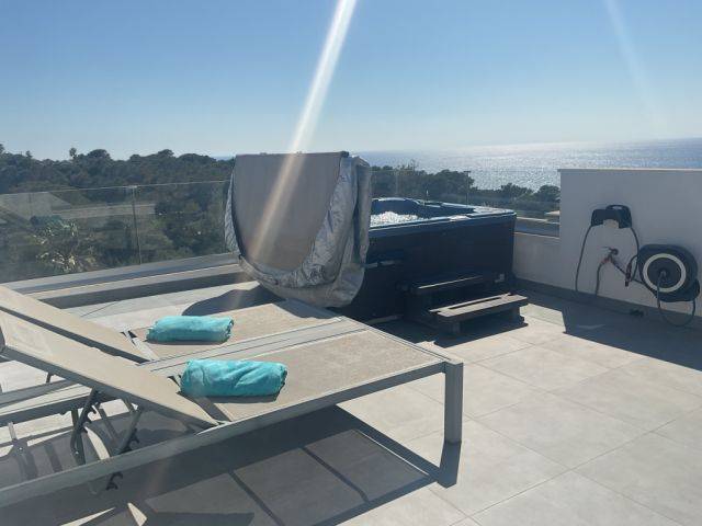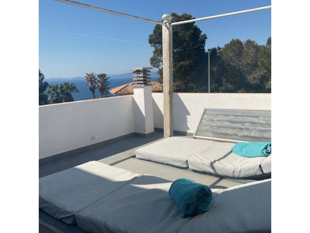 Der gesamte obere Bereich des Hauses ist als großzügige Master-Suite gestaltet, die über ein exklusives Badezimmer und zwei private Terrassen verfügt. Ein weiteres Highlight des Hauses ist die luxuriöse Dachterrasse von etwa 25 m², die mit einem beheizbaren Whirlpool Platz für 5 Personen ausgestattet ist und einen atemberaubenden Blick bis nach Palma bietet.