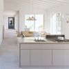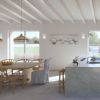 Zarci grauer Porzellanboden, weiße Tischlerei, Balken und weiße Decke.