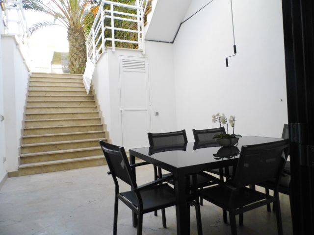 Das dreistöckige Haus hat im Erdgeschoss eine unüberdachte Terrasse mit Markise, im ersten Stock eine weitere unüberdachte Terrasse auf der sich der Waschraum mit Waschmaschine und Elektrotherme befindet, der Garten mit Zugang zur Seitenstraße sowie eine überdachte Terrasse mit Meerblick.