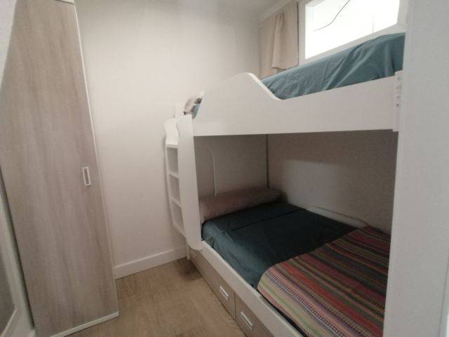 Der Eingangsbereich besteht aus einem hellen Flur, links davon befindet sich 1 Schlafzimmer mit Doppelbett, Smart-TV, Kleiderschrank und Nachttisch. Linkerhand am Ende des Flures befindet sich das 2. Schlafzimmer mit einem 2 - Etagenbett und Kleiderschrank.