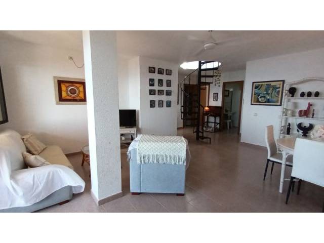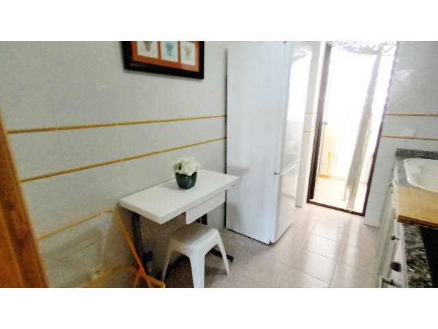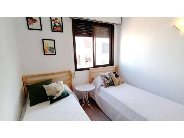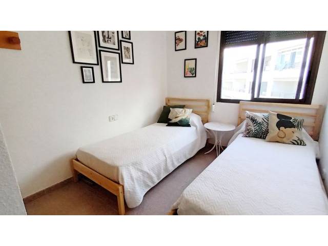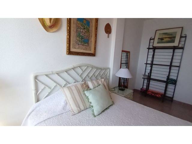 Eingangsbereich ist das Wohn-Esszimmer mit Terrassenzugang, rechts davon abgehend die taubenblaue Einbauküche mit Cerankochfelder, Kühlschrank, elektrischer Ofen und kleinem Frühstückstisch sowie angrenzendem Waschmaschinenbalkon. Es folgen noch 1 mittig gelegenes kleines Badezimmer ( ohne Fenster ) mit Badewanne und Dusche sowie einem Einbauschrank zum Verstauen von Utensilien und Handtüchern. Nebenanliegend zum Innenhof hin- 1 Schlafzimmer mit 2 Einzelbetten und Einbauschrank und rechts vom Bad gelegen – das Masterschlafzimmer mit Meerblick, Einbauschrank und einem Doppelbett von 1.80 m x 2 m