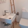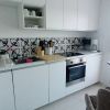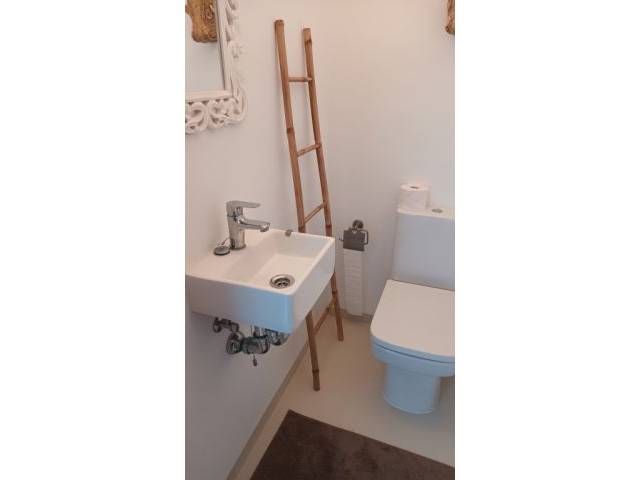Links gehend - 1 Badezimmer mit Dusche, 1 Gästetoilette und die schöne, weisse Einbauküche mit kleinem Frühstücksplatz und Terrassenzugang und das Masterschlafzimmer Doppelbett.