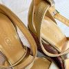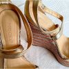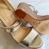 Material & Farbe: Die Sandalen verfügen über Riemen aus metallic-goldenem Leder und eine Keilsohle mit Streifen in Gold- und Kupfer-/Roségoldtönen, oft aus Bast oder geflochtener Jute gefertigt.