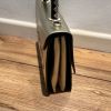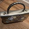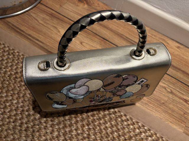 Die Tasche aus Leder hat auf beiden Seiten verschiedene Applikationen und verfügt auch über einen Schultergürtel