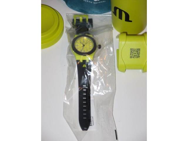 Die Uhr wurde nur für die Fotos ausgepackt und wird mit dem Originalzubehör (Karton, "Seesack", Trinkbecher und Uhrenhalterung) verkauft.