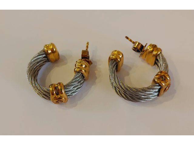 Sehr gut erhaltenes Set vom bekannten Designer Philippe Charriol, Uhr (Quarzwerk), Ring, Armband u. 2 Creolen, aus Stahl mit Applikationen aus Silber vergoldet, komplett gereinigt.
