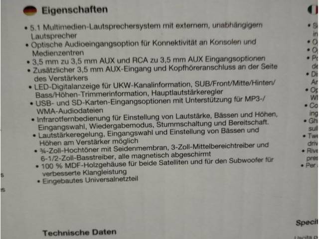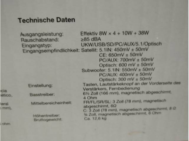 - Lautsprecher: 1 Subwoofer, 4 Satellitenlautsprecher und 1 Center-Lautsprecher