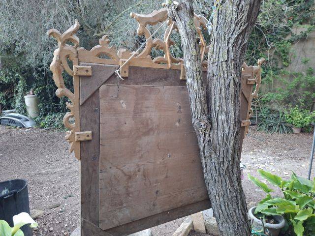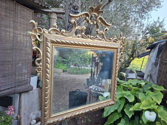 Antiker geschnitzter Spiegel, mit Blattgold bezogen, Maße: Breite 85 cm, Höhe 1,15 m, in gutem Zustand, kein Holzwurmbefall.
