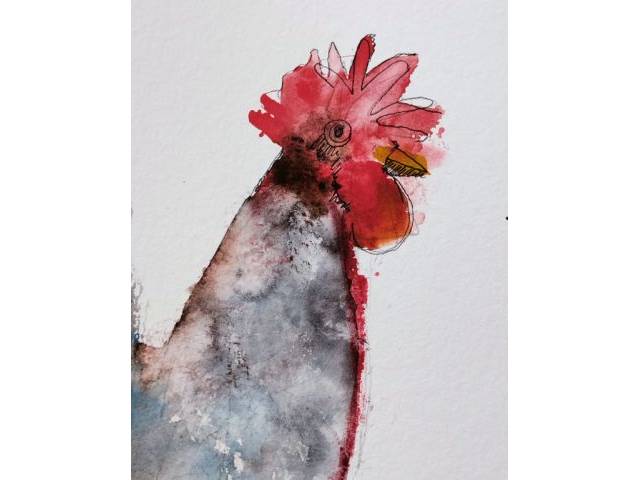 Hahn in Aquarell mit abstrakten Akzenten, Aquarell und Tusche auf 425 g Papier
