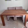 Stabiler Holz-Esstisch in sehr gutem Zustand mit vier gut gepolsterten Sesseln auf Rollen. Sessel lassen sich vollständig unter den Tisch schieben. Ideal für Essbereich oder offene Küche.