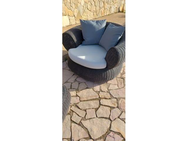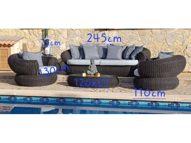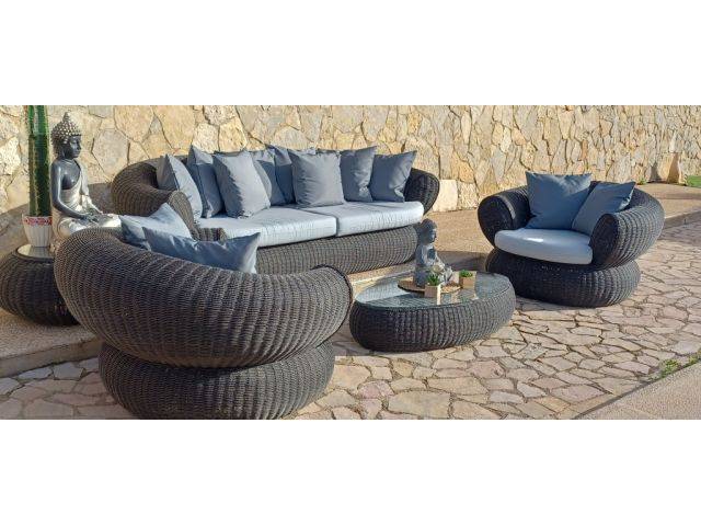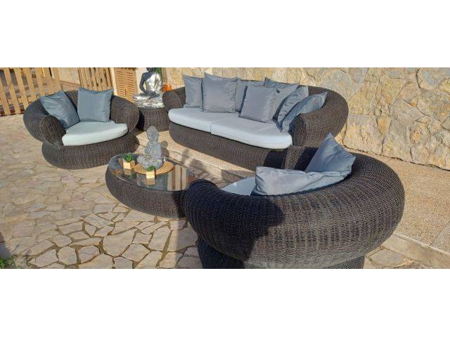 Großes Sofa + 2 Sessel + großer Beistelltisch und ein kleiner, mit allen sichtbaren Kissen. (Ohne Dekoration)