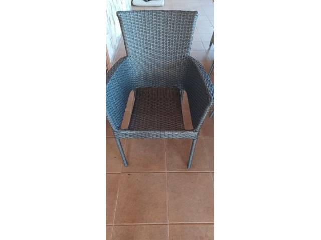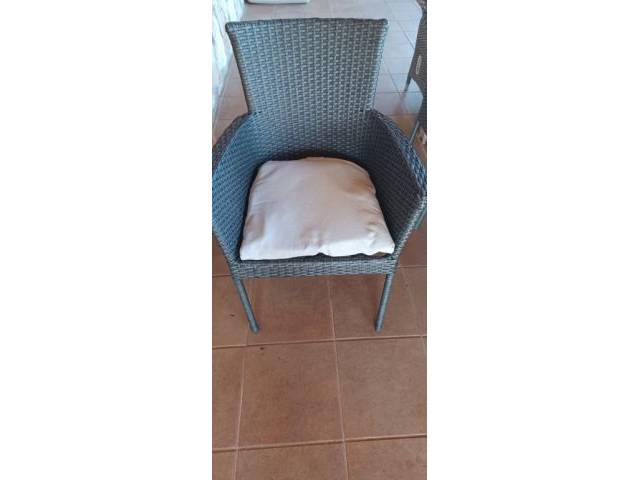 Aluminiumtisch mit gestell in Holzoptik, Sessel aus synthetischem Rattan in grauer Farbgebung mit inklusive Kissen. Stapelbare Sessel.