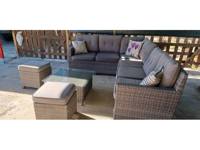 Eck-Gartensofa aus synthetischem Rattan, Tisch und Pouf. Mit Kissen in Grau.