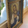 Dieses antike Kunststück zeigt die Jungfrau Maria in einem Moment des Gebets oder der Kontemplation. Es ist eingefasst in einem hochwertigen Holzrahmen mit seitlichen Malereien.