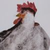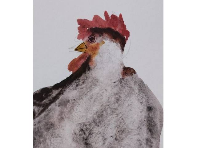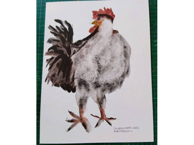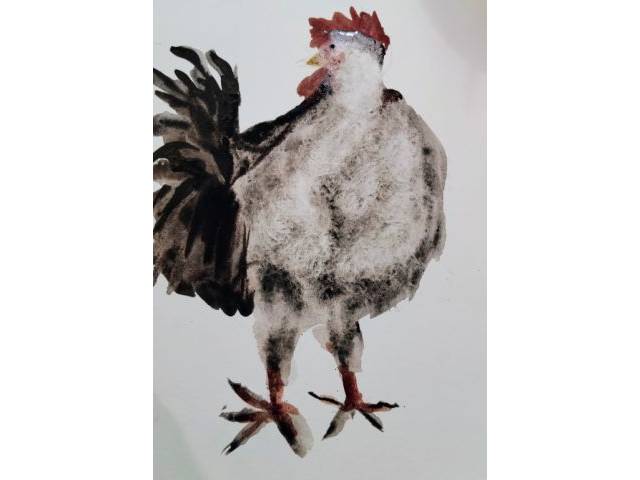 Hahnenbild auf Papier mit schwarzlichen, grauen und roten Tönen, expressive Malerei mit freien Pinselstrichen