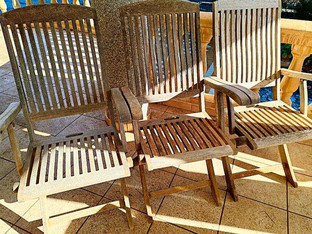 Das Holz, in der Bildern zu sehen, weist eine typische silbergraue Patina auf, die entsteht, wenn Teakholz unbehandelt der Witterung ausgesetzt ist. Wem die Patina nicht gefällt, kann sie mit einem Teak-Entgrauer oder durch leichtes Anschleifen entfernen, um einen warmen Goldton wieder hervorzuholen.