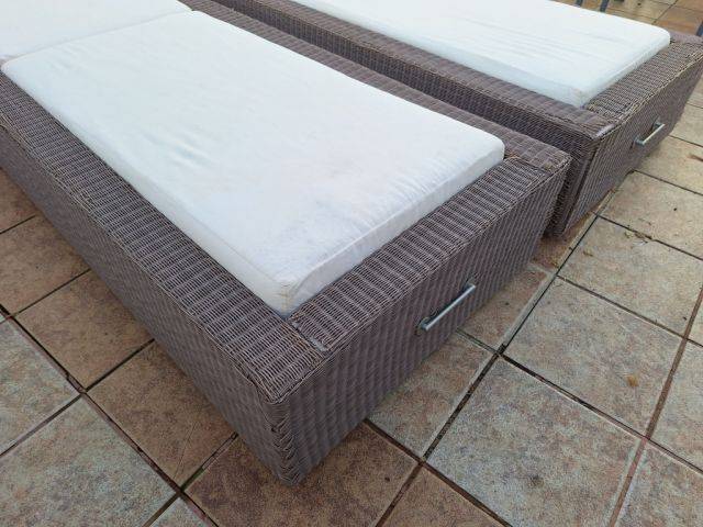 Die Liegen sind gebraucht und weisen normale Spuren auf. Wichtiger Hinweis: An den Ecken (siehe Fotos) ist das Polyrattan-Geflecht leicht beschädigt. Dies ist ein rein optischer Makel und beeinträchtigt das Liege-Vergnügen in keiner Weise – die Liegen sind strukturell stabil und funktionsfähig!