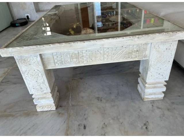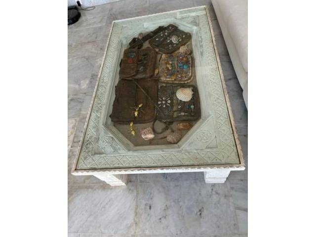 Marokkanischer Couchtisch aus Holz, ist alt. Kommt auch mit den Taschen und sieht sehr schön im Haus aus.