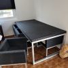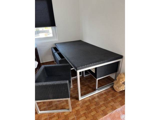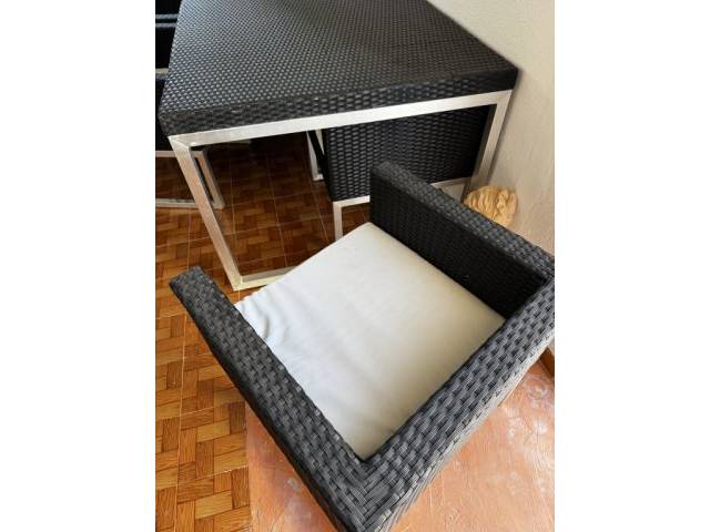 Neuwertige Terrassensitzgruppe, sechs Stühle, ein Tisch und sechs Polsterauflagen.