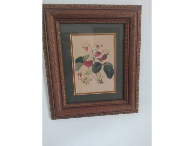 Gerahmte botanische Illustration einer Erdbeerpflanze (Fragaria) und Birnen.