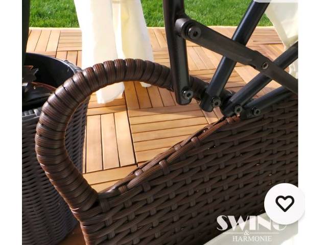 Marke Swing&Harmonie® kann durch die modulare Bausweise sowohl als große Liegefläche, sowie als Sitzgruppe für mehrere Personen genutzt werden. Die Polyrattanfaser wurde von Hand auf den pulverbeschichteten Rahmen geflochten. Diese ist äußerst wetterresistent, pflegeleicht und trotzt Hitze, Frost, Chlor und Salzwasser.