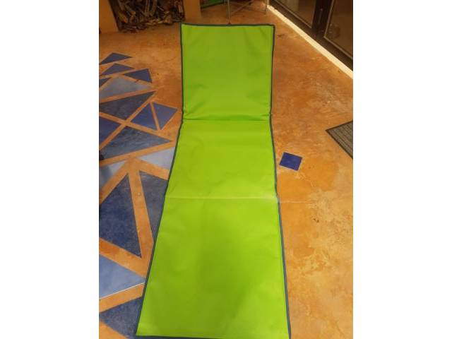 grün, flache leicht gepolsterte Liegeauflage mit Rückengestell, so dass man sich anlehnen kann, Preis 15,-