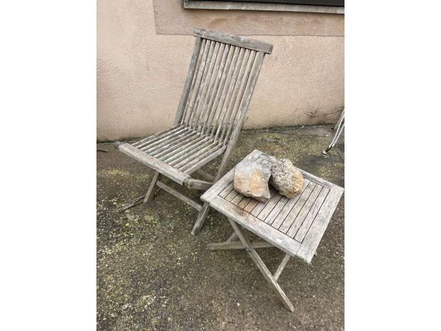 Teakstuhl mit Tisch (am Bein etwas beschädigt)