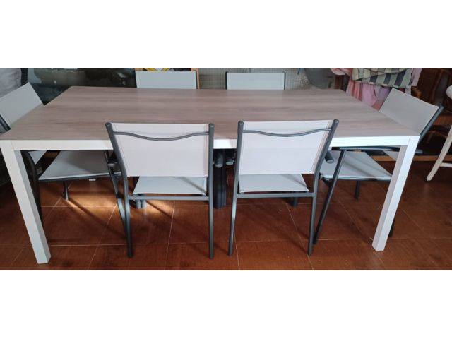 Tisch und 6 Gartenstühle.