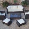 Dieses Outdoor-Sofa-Set besteht aus einem 3-Sitzer-Sofa, zwei Sesseln, zwei Liegestühlen und einem Beistelltisch in Bronzebraun.