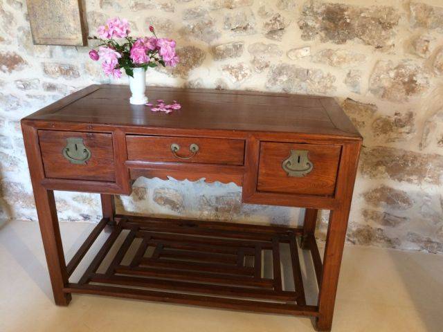 ... mit Gitterfussstütze und 3 Schubladen. Guter Zustand. Masse: 116 cm breit, 60 cm tief, 83,5 cm hoch. Vermutlich im 19. Jahrhundert aus Ulmenholz gefertigt.