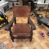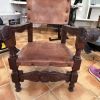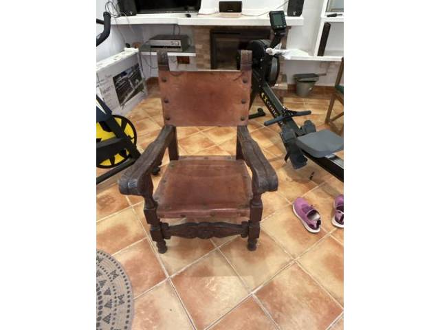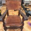 Schwerer, rustikaler Ledersessel im klassischen spanischen Stil, vermutlich um 1900, im sogenannten „Frayle“-Stil (Mönchsstuhl). Das massive Holzgestell ist kunstvoll geschnitzt, die Sitz- und Rückenfläche mit vernietetem Echtleder bezogen – alles original und authentisch.