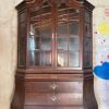 schöne Patina, Schwungvolle, bombierte Form (Kommodenkorpus), Aufwendiges Schnitzwerk (am Sockel und an den Füßen, barocktypische Voluten), Originale Messingbeschläge, Glasvitrine im oberen Teil mit mehrfach unterteiltem Glas (Sprossenfenster), Wellenförmiger Giebel mit Schnitzornament in der Mitte (Muschelmotiv, Rokoko-Einfluss), Hochwertiges Holz