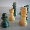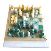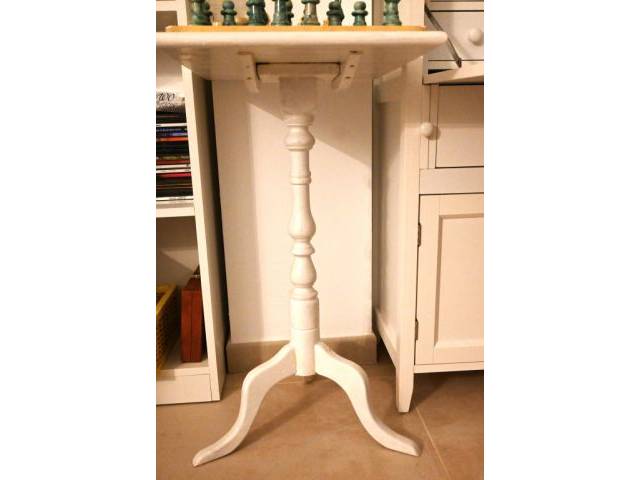 Ein schönes Schachspiel aus weißem / hellblaugrünem Alabaster (ähnliche Optik wie Marmor) aus Volterra/Italien mit weißem Tisch (Holz, mattweiß lackiert), mit zusätzlichen Steinen für das Damespiel, ebenfalls aus Alabaster. Tischhöhe 75 cm (normale Tischhöhe), Tischfläche 48 x 40 cm, Schachbrettgröße 37 x 37 cm, Figurenhöhe König = 7,5 cm.