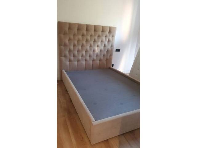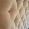 Designer Bett von Portic Mueble in der Farbe beige taupe in einer speziellen Samt Prägung. Sonderanfertigung wegen extra hohem Kopfteil und Anti Kratz Stoff ( sofern evtl. Haustiere)