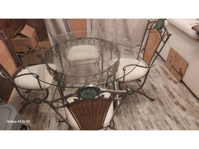 Zum Verkauf steht ein hochwertiger runder Esstisch (120 cm) inklusive 6 passender Stühle aus geschmiedetem Eisen mit Glaselementen.