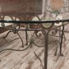 Der Tisch ist mit einer stailen Glasplatte ausgestattet, die nicht nur optisch leicht wirkt, sondern auch pflegeleicht ist. Die Stühle sind ebenfalls aus geschmiedetem Eisen gefertigt und harmonieren perfekt mit dem Tisch.