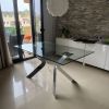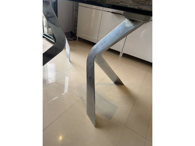 Der Tisch besteht aus einer Glasplatte und einem massiven silbernen Gestell.