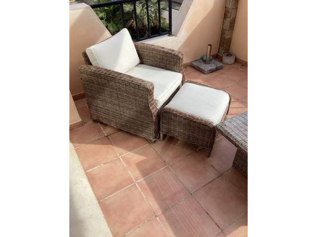 Verkaufen unsere Terrassen Stühle (2) mit 2 Tischen und einem Fußteil incl. Polster.