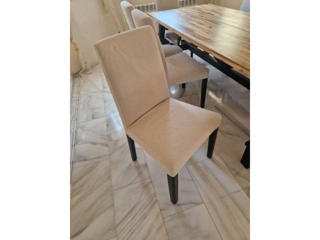Zu dem Tisch gehören 8 Stühle mit einer Sitzfläche von ca. 50x50cm und einer Lehnenhöhe von 95cm. Das Stuhlgestell besteht aus schwarz lackiertem Echtholz. Der Bezug der Sitzfläche und Lehne sind beigefarbend. Der Neupreis von einem Stuhl liegt bei ca. 90€. Gekauft wurden sie 2022 bei Ikea, Modell Bergmund.