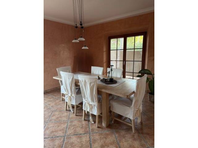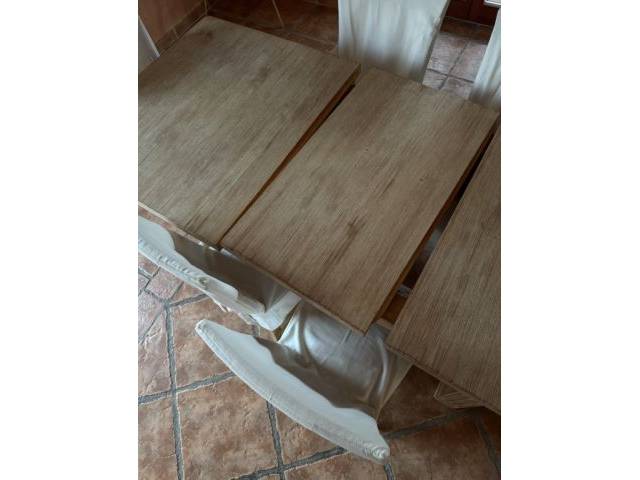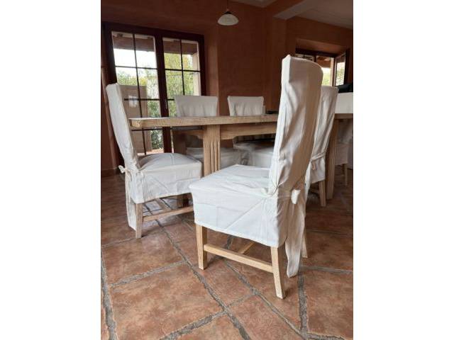 Dieser Esstisch aus massivem Holz besticht durch sein zeitloses Design, seine robuste Qualität und seine praktische Funktionalität. Der Tisch kann durch das Entfernen des mittleren Elements um 50cm verkleinert werden, was ihn flexibel für verschiedene Raumgrößen macht. Das Holz ist schwer und sehr stabil, was auf Massivholz wie Eiche oder Teak hinweisen könnte. Die Oberfläche zeigt eine natürliche Holzmaserung. Die Stühle sind ebenfalls stabil und werden mit abnehmbaren, frisch gewaschenen Hussen verkauft, die im Preis inbegriffen sind. Zudem sind sie gepolstert. Diese verleihen dem Set eine elegante Note und schützen die Stühle.