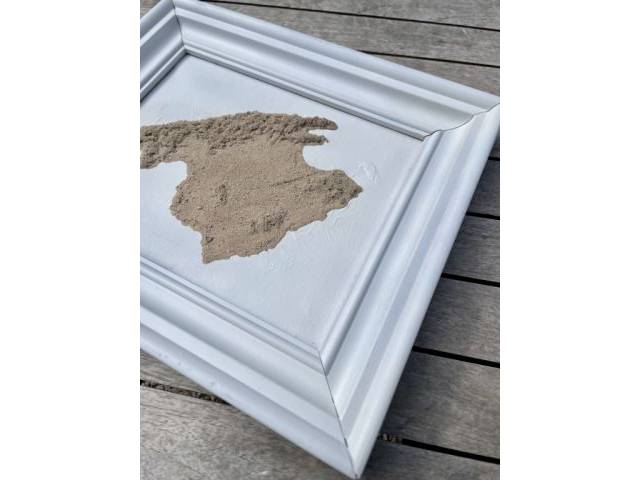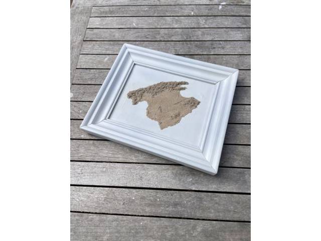 Verkaufe ein außergewöhnliches Mallorca Bild. Die Insel ist als Relief aus Sand gearbeitet auf weißem Untergrund mit einem HolzRahmen in weiß. Abmessungen: ca. 32x27 cm. Unikat.