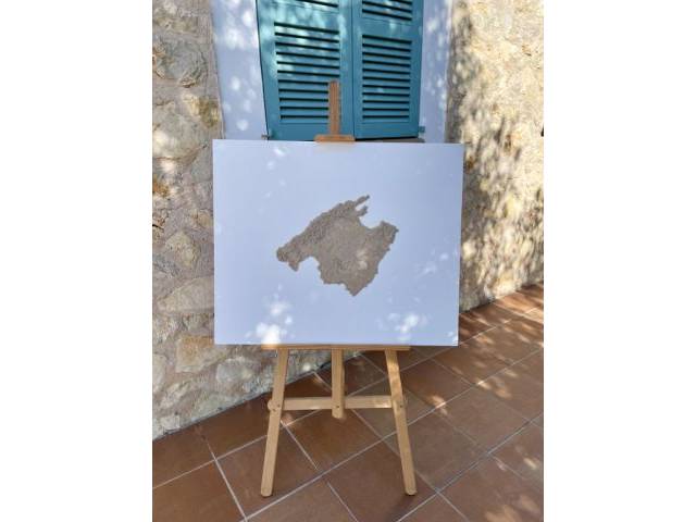 Verkaufe ein außergewöhnliches Mallorca Bild. Die Insel ist als Relief aus Sand gearbeitet auf einer großen schweren Holzplatte. Abmessungen: ca. 85x70 cm. Unikat.