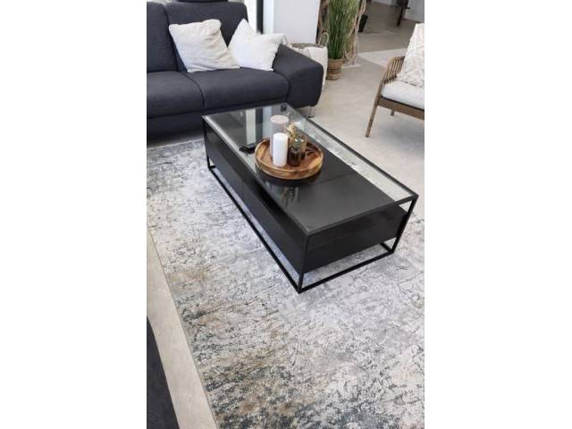 Couchtisch mit schwarzem Aluminiumrahmen und schwarzem Holzkorpus inklusive zwei Schubladen. Die Tischplatte ist eine Glasplatte.