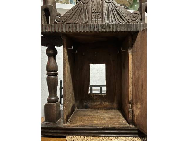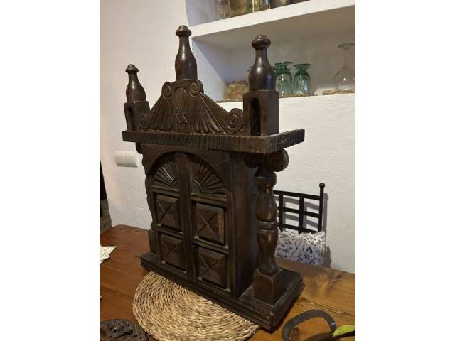 Holz Schlüsselkasten /-Schränkchen, Wandaufhängung oder zum Stellen, innen Haken für Schlüssel oder Sonstiges, auf der Rückseite wurde ein Loch für einen Schalter ausgesägt, dies kann leicht wieder geflickt werden, Maße Höhe 60 cm, Breite 43 cm, Tiefe 20 cm, Standort Capdepera