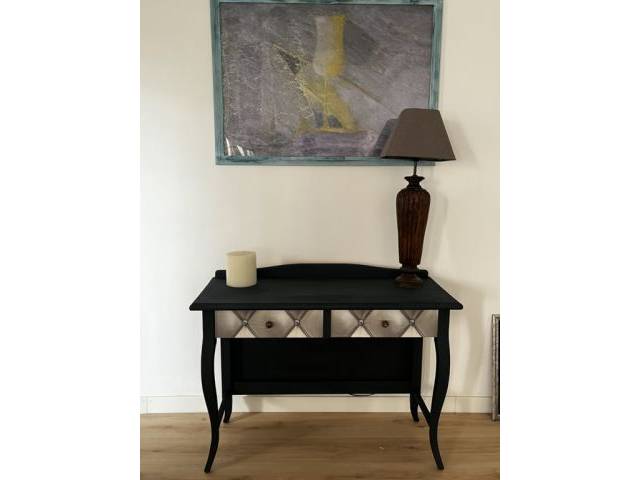 Sidebord im Landhausstil 120 cm breit in matt schwarz mit Decor auf den Schubladen und und den Seiten bespannt 2 Schubladen