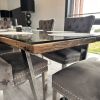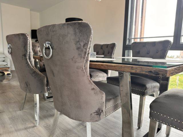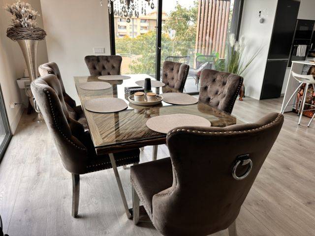 Die Stühle sind sehr edel. Auf dem Bild sind 6 Stühle zu sehen, insgesamt gehören 8 Stühle dazu. Die Stuhlbeine sind aus Stahl und sehr stabil.